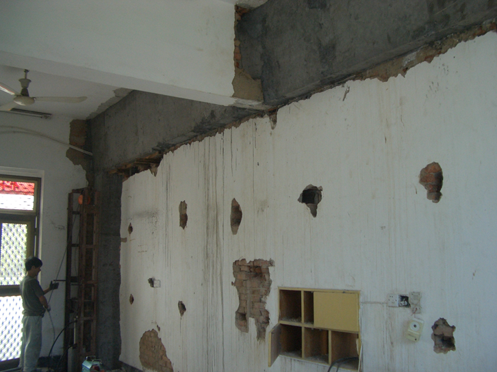 (八)體内預應力用于拆除荷載和跨度均很大的承重牆當承重牆所受荷載很大,而且改造後跨度也較大時,如果采用非預應力托換剛架技術,在拆牆以後将會産生較大的撓度,從而導緻上部樓面闆和牆體開裂;如果采用體外預應力技術,則因爲需要配置的鋼絞線數量太多而無法布置。在這種情況下采用“後張無粘結高強鋼絞線體内預應力托換剛架技術"最爲理想。下面爲這種技術的代表工程: 1.浙江甯海縣巴黎春天服裝店拆牆改造工程: 該工程爲五層磚混結構房屋,底層爲服裝店,因營業需要,要求将底層一道承重牆拆除,下面爲加固施工和使用中的照片;