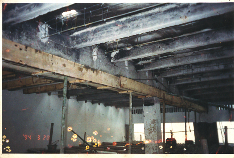 (十六)鋼筋混凝土闆的加固技術當闆被火災燒損,或闆的混凝土強度嚴重偏低,或闆上荷重增加較多時,我們除采用“鋼支托無粘結鋼絞線下撐式拉杆法”以外,還采用了在闆底增設鋼筋混凝土梁或無粘結鋼絞線預應力梁的方法。在闆底設了梁以後,除闆得到加固外,與新增梁同一方向的原樓面梁也由于所承受的荷載減輕同時得到了補強。當新增梁爲多跨連續梁時,爲了防止因新澆混凝土收縮引起新增梁開裂,新增連續梁宜采用無粘結鋼絞線預應力配筋。 1、浙江餘杭儀表廠火災受損屋面梁、闆加固: 屋面梁采用鋼絞線體外預應力加固法進行加固,屋面闆爲預制小梁現澆闆,采用在二根預制小梁之間再增加一根現澆小梁的辦法進行加固。下面爲施工 中和加固後的照片: